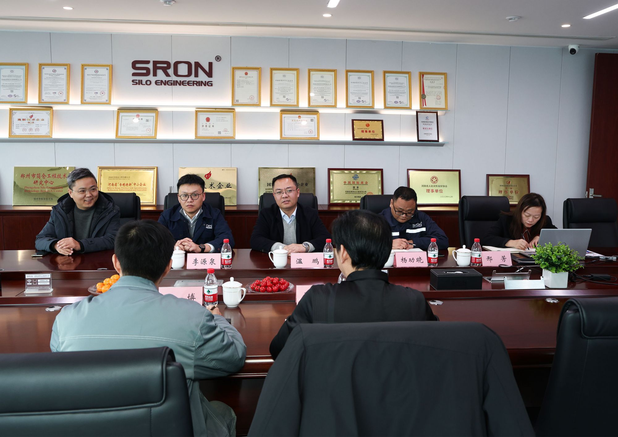 座谈交流会上,实荣公司董事长温鹏首先对裴秘书长一行的到来表示热烈欢迎,并对水泥协会长期以来给予的支持表示感谢。随后,温总介绍了实荣的企业概况、技术优势及项目实施情况。他表示,实荣面向全球致力为建材、粮食、矿产、煤炭、能源、冶金、化工等行业的大宗散装物料存储和搬运的工业基础设施建设领域提供EPC总承包服务。公司先后获得国家高新技术企业,省级“专精特新”企业,郑州市筒仓工程技术中心等荣誉。目前,实荣在水泥建材散料储运工程领域已经形成了自己的核心竞争力,并积累了丰富的海外项目落地经验。同时,实荣积极响应“一带一路”国家战略,将代表中国(行业)水准的工程技术设计能力、装备制造水平和管理经验带出国门,先后在全球30多个国家和地区承揽了工程项目,深受海内外客户好评。最后,温总希望通过水泥协会搭建的平台,与更多水泥建材相关企业开展深度合作,为助力推动水泥建材行业高质量发展贡献力量。