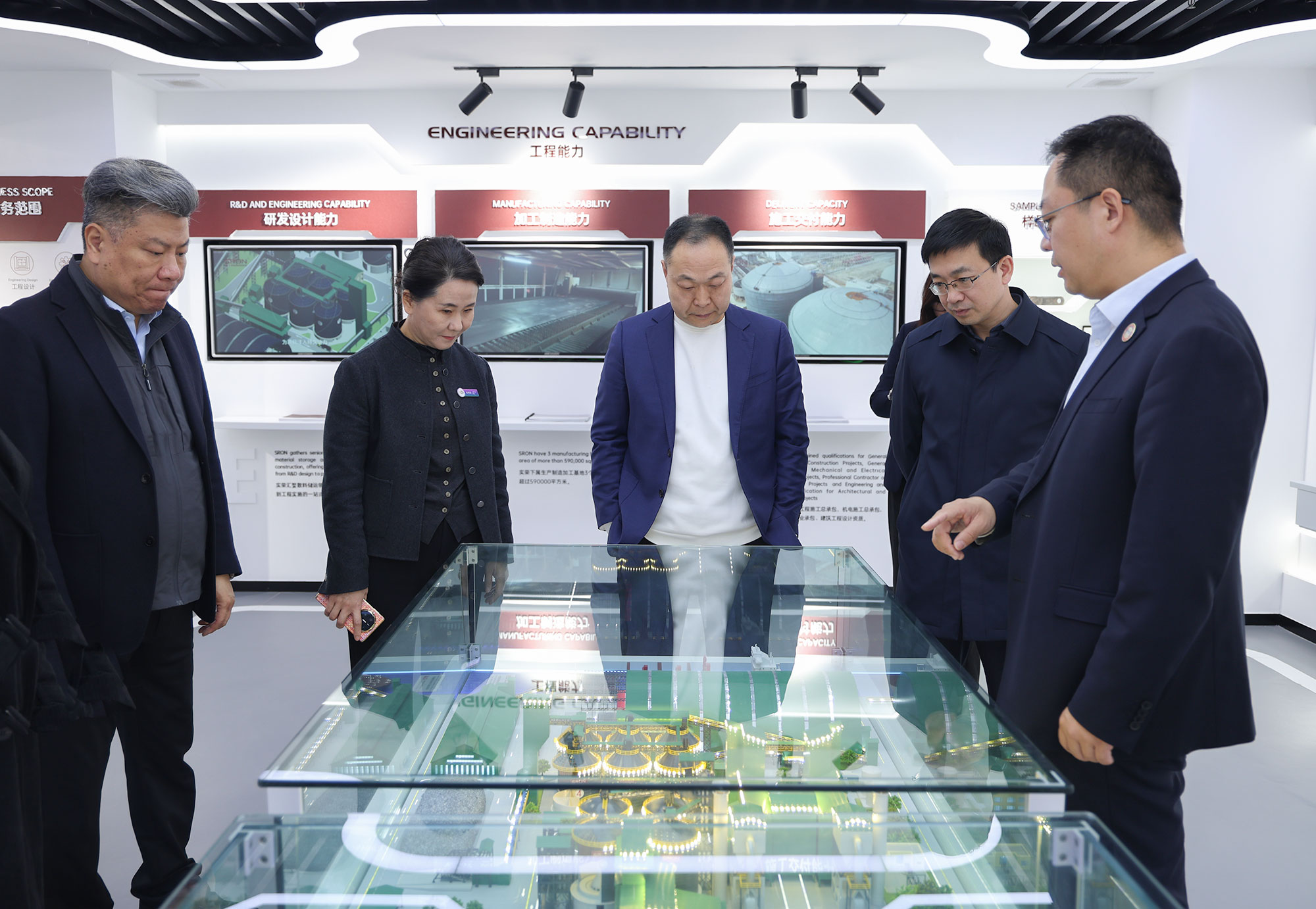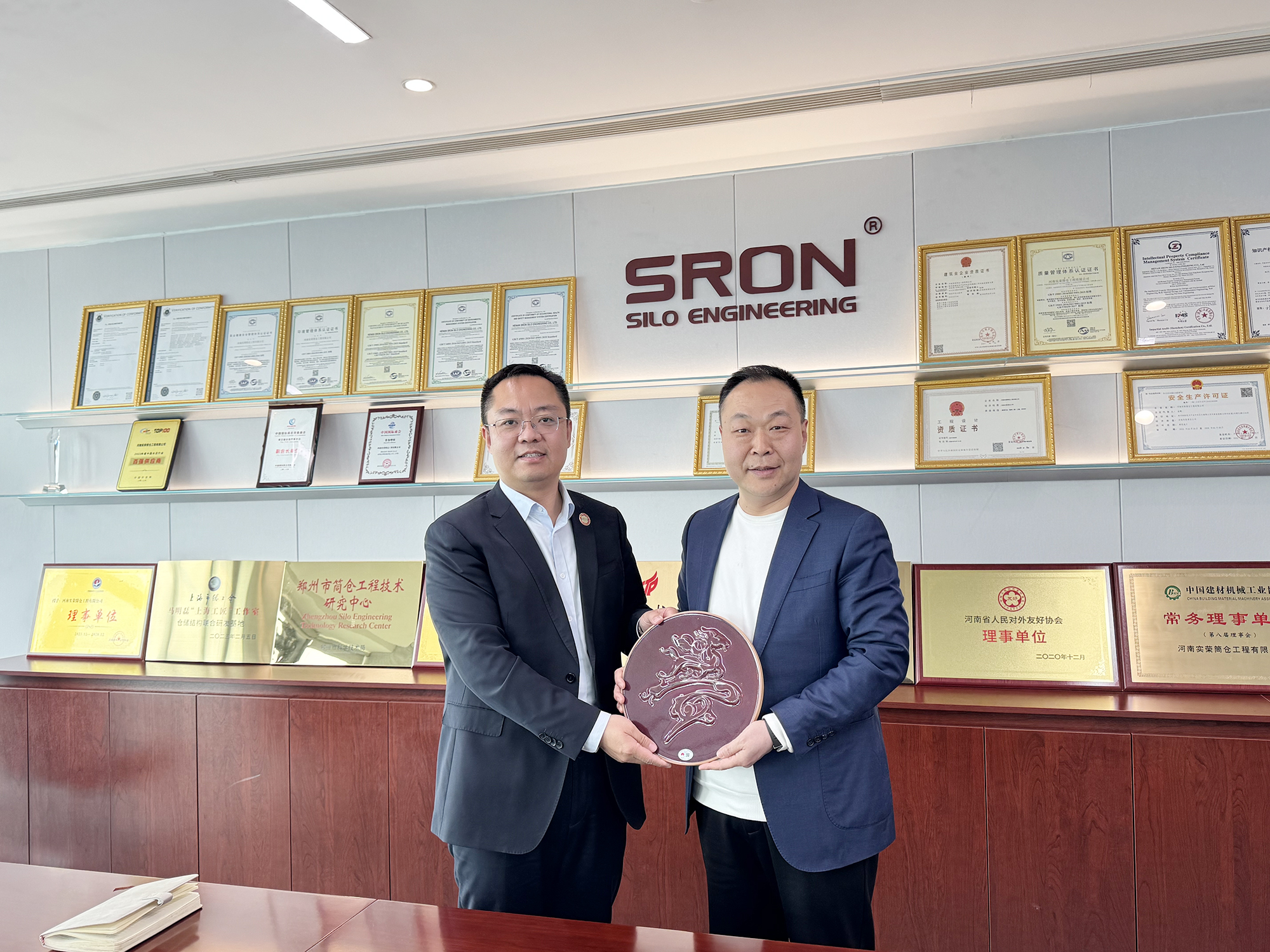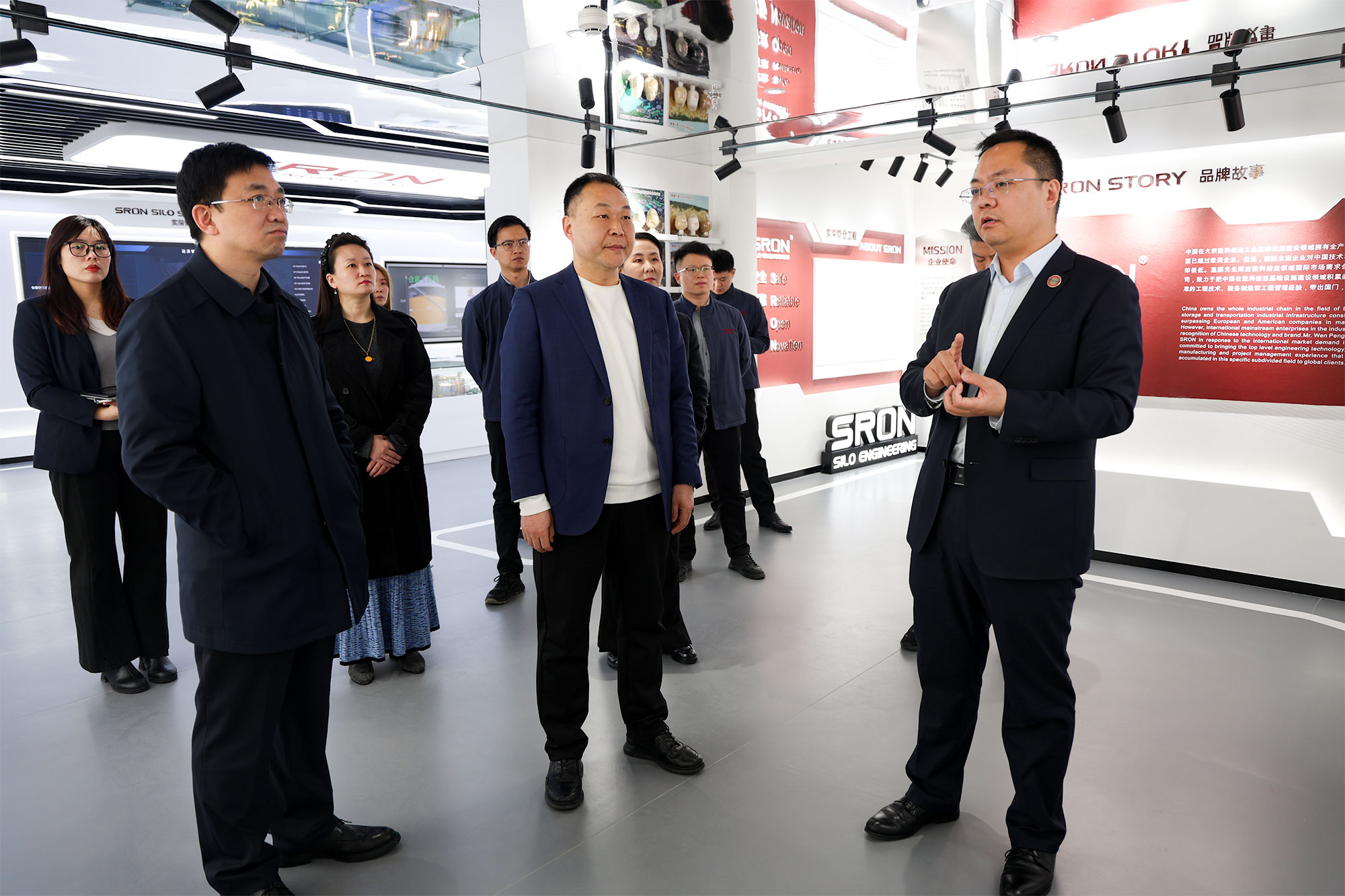 考察伊始,在温鹏董事长及高管团队的陪同下,校友会领导一行参观了实荣智慧展厅。身为大宗散料储运行业开创者和品牌出海的引领者,实荣展厅生动呈现了公司发展历程、核心技术及全球布局。校友会领导深入了解了实荣在大宗散料储运领域的智能化解决方案——从数字化设计、智能制造到施工全流程管控,实荣已构建起完整的智能化工程交付体系。