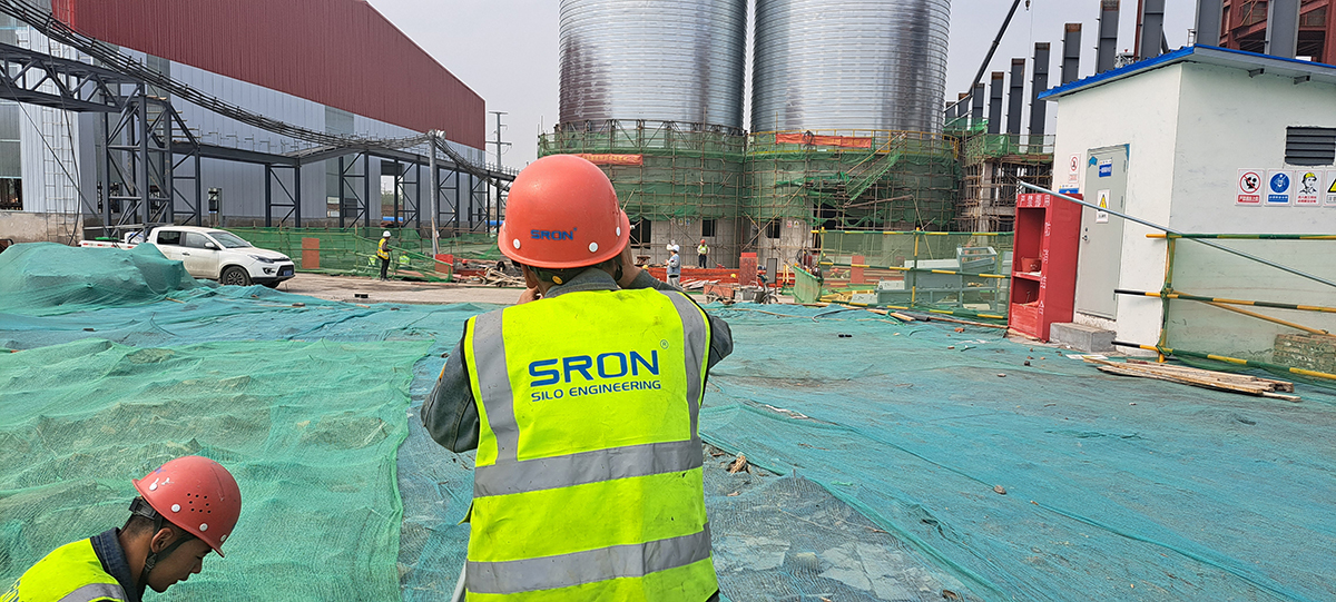 图为:实荣承建的山东国材8X2500t高岭岩卷边仓项目